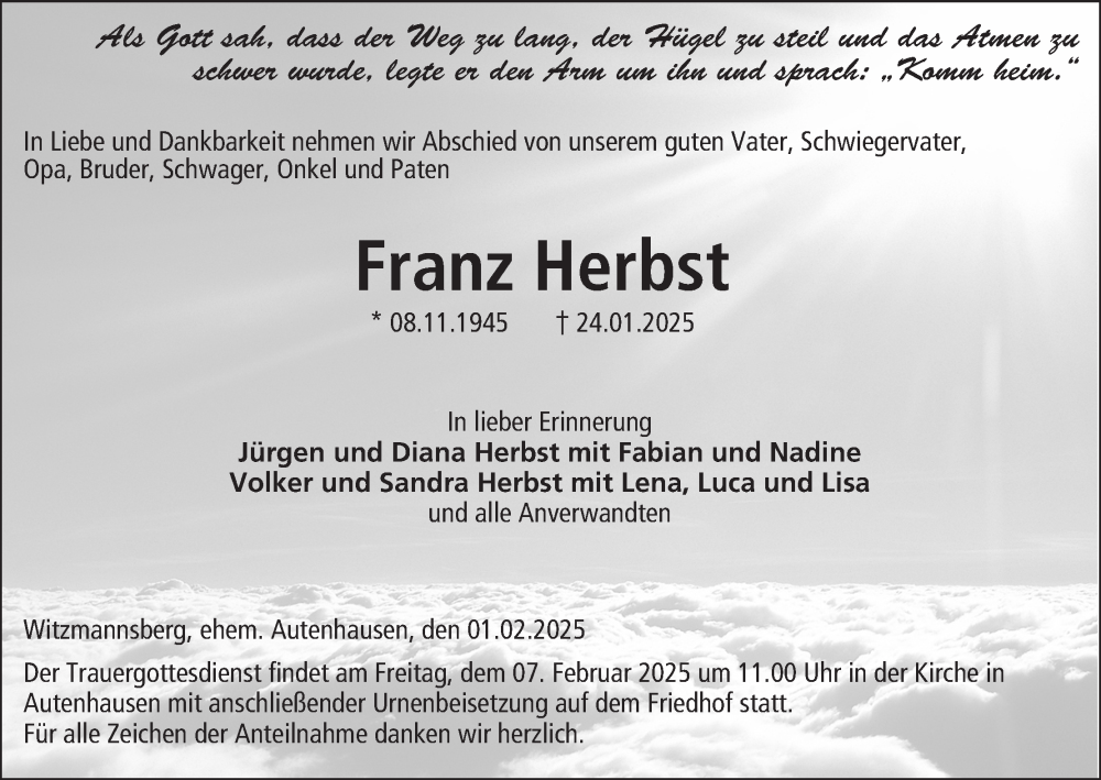 Hier finden Sie alle Traueranzeigen aus der Zeitung, die bisher für Franz Herbst erschienen sind. Weitere Traueranzeigen, die in der Zeitung erscheinen, werden hier ebenfalls aufgelistet