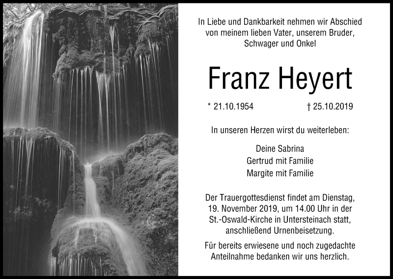 Hier finden Sie alle Traueranzeigen aus der Zeitung, die bisher für Franz Heyert erschienen sind. Weitere Traueranzeigen, die in der Zeitung erscheinen, werden hier ebenfalls aufgelistet