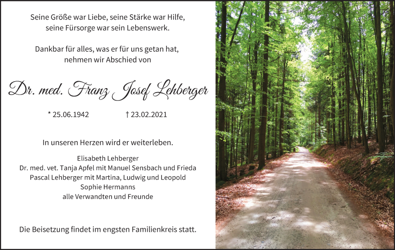 Hier finden Sie alle Traueranzeigen aus der Zeitung, die bisher für Franz Josef Lehberger erschienen sind. Weitere Traueranzeigen, die in der Zeitung erscheinen, werden hier ebenfalls aufgelistet