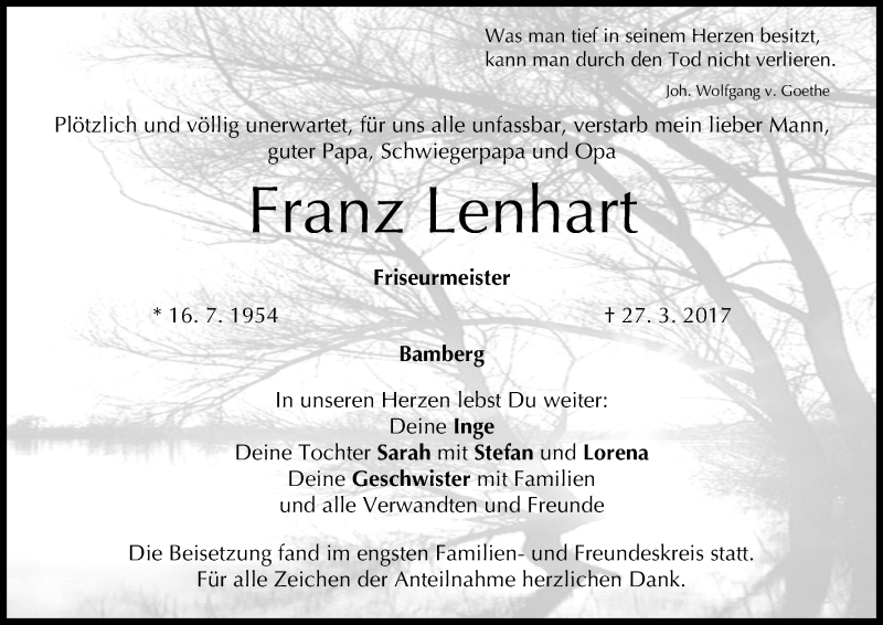 Hier finden Sie alle Traueranzeigen aus der Zeitung, die bisher für Franz Lenhar erschienen sind. Weitere Traueranzeigen, die in der Zeitung erscheinen, werden hier ebenfalls aufgelistet