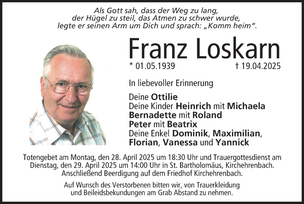 Hier finden Sie alle Traueranzeigen aus der Zeitung, die bisher für Franz Loskarn erschienen sind. Weitere Traueranzeigen, die in der Zeitung erscheinen, werden hier ebenfalls aufgelistet