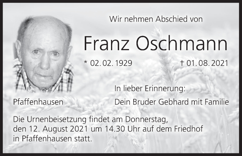 Hier finden Sie alle Traueranzeigen aus der Zeitung, die bisher für Franz Oschmann erschienen sind. Weitere Traueranzeigen, die in der Zeitung erscheinen, werden hier ebenfalls aufgelistet