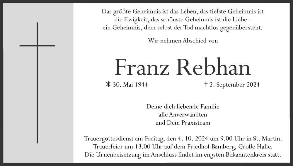 Hier finden Sie alle Traueranzeigen aus der Zeitung, die bisher für Franz Rebhan erschienen sind. Weitere Traueranzeigen, die in der Zeitung erscheinen, werden hier ebenfalls aufgelistet