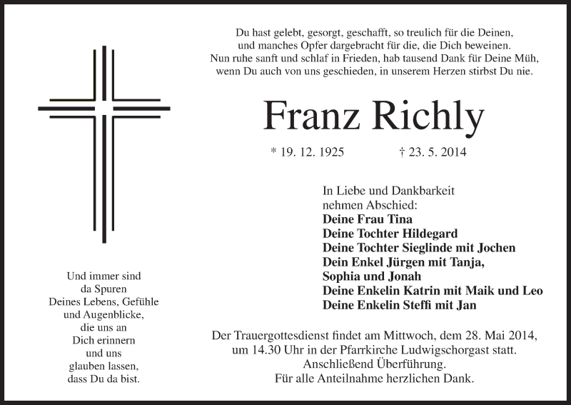 Hier finden Sie alle Traueranzeigen aus der Zeitung, die bisher für Franz Richly erschienen sind. Weitere Traueranzeigen, die in der Zeitung erscheinen, werden hier ebenfalls aufgelistet