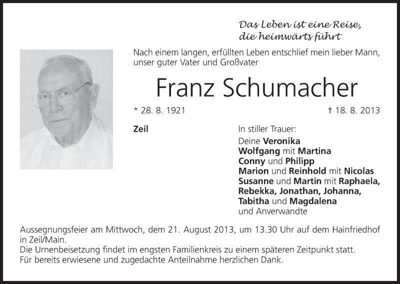 Hier finden Sie alle Traueranzeigen aus der Zeitung, die bisher für Franz Schumacher erschienen sind. Weitere Traueranzeigen, die in der Zeitung erscheinen, werden hier ebenfalls aufgelistet