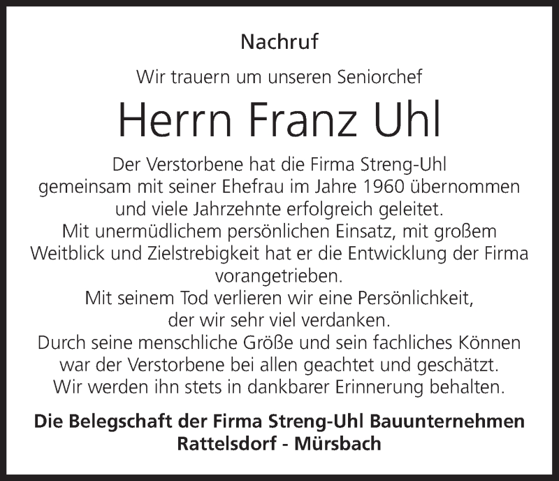 Hier finden Sie alle Traueranzeigen aus der Zeitung, die bisher für Franz Uhl erschienen sind. Weitere Traueranzeigen, die in der Zeitung erscheinen, werden hier ebenfalls aufgelistet