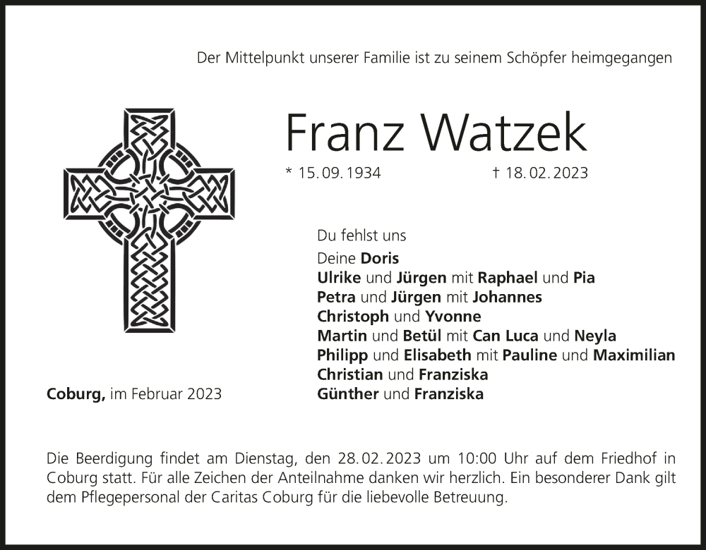 Hier finden Sie alle Traueranzeigen aus der Zeitung, die bisher für Franz Watzek erschienen sind. Weitere Traueranzeigen, die in der Zeitung erscheinen, werden hier ebenfalls aufgelistet