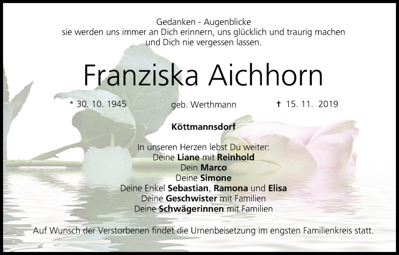 Hier finden Sie alle Traueranzeigen aus der Zeitung, die bisher für Franziska Aichhorn erschienen sind. Weitere Traueranzeigen, die in der Zeitung erscheinen, werden hier ebenfalls aufgelistet