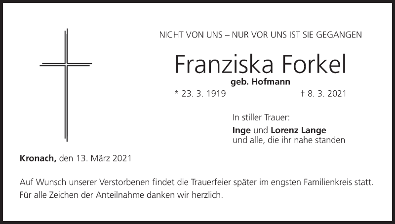 Hier finden Sie alle Traueranzeigen aus der Zeitung, die bisher für Franziska Forkel erschienen sind. Weitere Traueranzeigen, die in der Zeitung erscheinen, werden hier ebenfalls aufgelistet