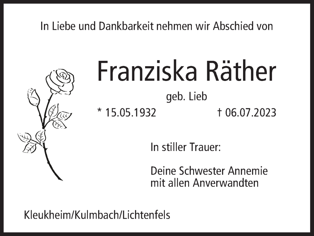 Hier finden Sie alle Traueranzeigen aus der Zeitung, die bisher für Franziska Räther erschienen sind. Weitere Traueranzeigen, die in der Zeitung erscheinen, werden hier ebenfalls aufgelistet