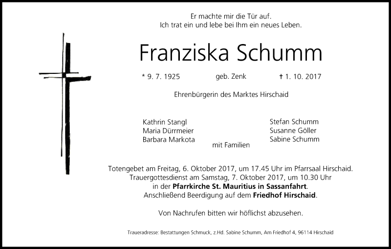Hier finden Sie alle Traueranzeigen aus der Zeitung, die bisher für Franziska Schumm erschienen sind. Weitere Traueranzeigen, die in der Zeitung erscheinen, werden hier ebenfalls aufgelistet