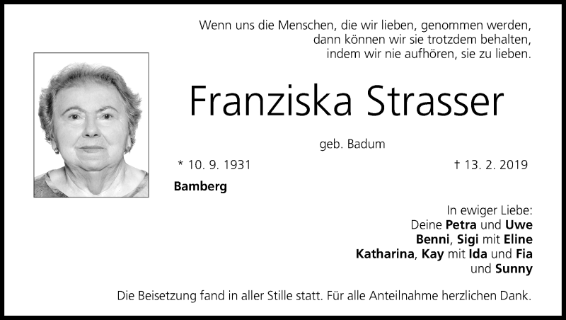 Hier finden Sie alle Traueranzeigen aus der Zeitung, die bisher für Franziska Strasser erschienen sind. Weitere Traueranzeigen, die in der Zeitung erscheinen, werden hier ebenfalls aufgelistet