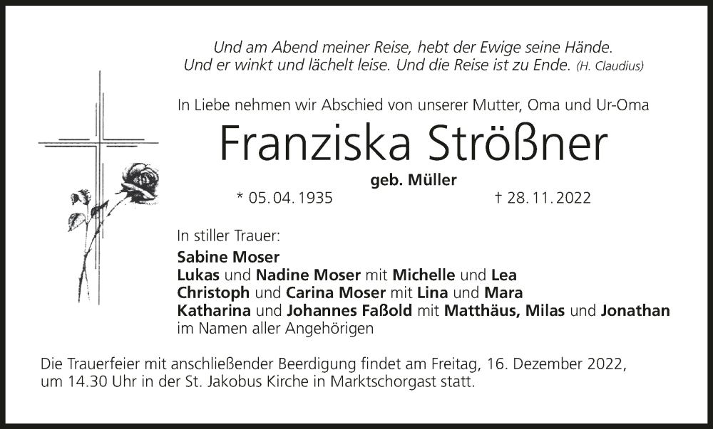 Hier finden Sie alle Traueranzeigen aus der Zeitung, die bisher für Franziska Strößner erschienen sind. Weitere Traueranzeigen, die in der Zeitung erscheinen, werden hier ebenfalls aufgelistet