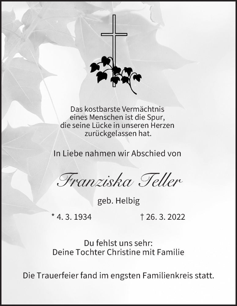 Hier finden Sie alle Traueranzeigen aus der Zeitung, die bisher für Franziska Teller erschienen sind. Weitere Traueranzeigen, die in der Zeitung erscheinen, werden hier ebenfalls aufgelistet