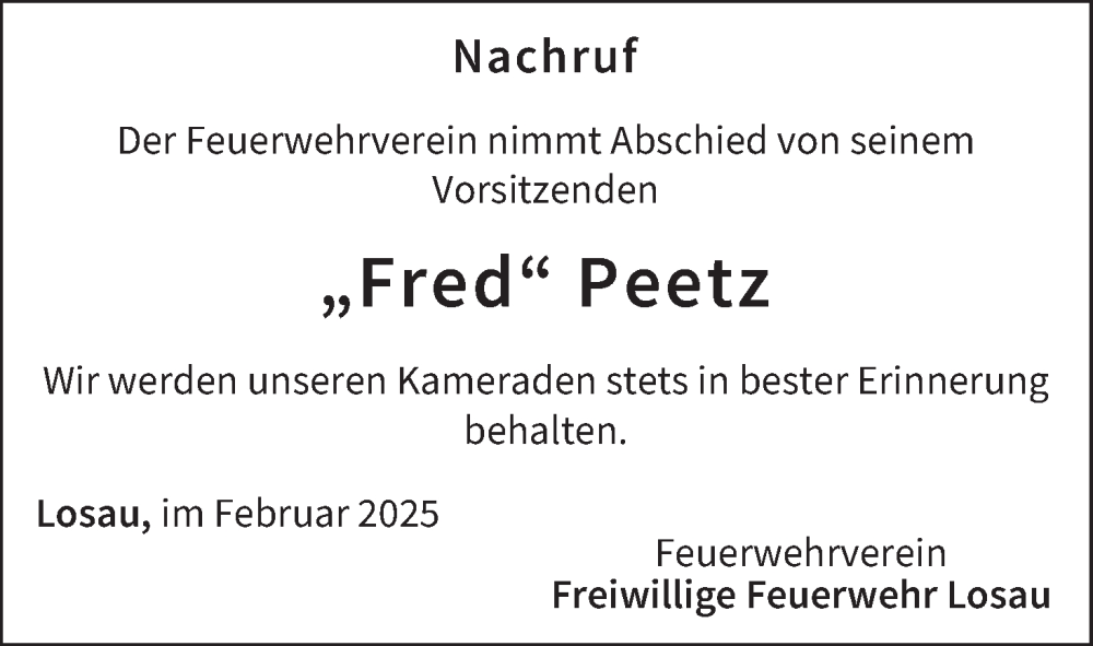 Hier finden Sie alle Traueranzeigen aus der Zeitung, die bisher für Fred Peetz erschienen sind. Weitere Traueranzeigen, die in der Zeitung erscheinen, werden hier ebenfalls aufgelistet