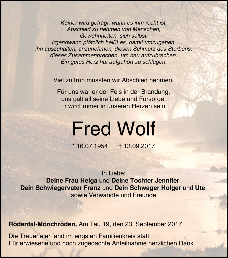 Hier finden Sie alle Traueranzeigen aus der Zeitung, die bisher für Fred Wolf erschienen sind. Weitere Traueranzeigen, die in der Zeitung erscheinen, werden hier ebenfalls aufgelistet