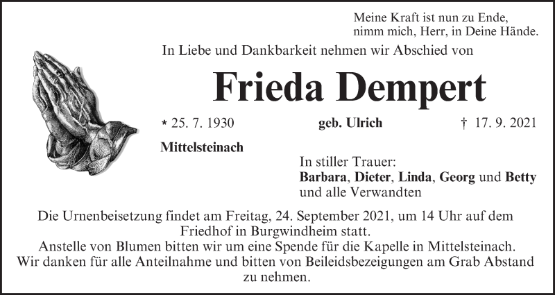 Hier finden Sie alle Traueranzeigen aus der Zeitung, die bisher für Frieda Dempert erschienen sind. Weitere Traueranzeigen, die in der Zeitung erscheinen, werden hier ebenfalls aufgelistet