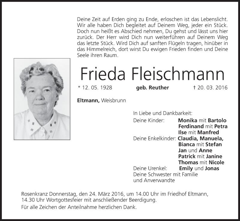 Hier finden Sie alle Traueranzeigen aus der Zeitung, die bisher für Frieda Fleischmann erschienen sind. Weitere Traueranzeigen, die in der Zeitung erscheinen, werden hier ebenfalls aufgelistet