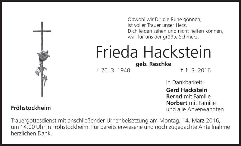 Hier finden Sie alle Traueranzeigen aus der Zeitung, die bisher für Frieda Hackstein erschienen sind. Weitere Traueranzeigen, die in der Zeitung erscheinen, werden hier ebenfalls aufgelistet