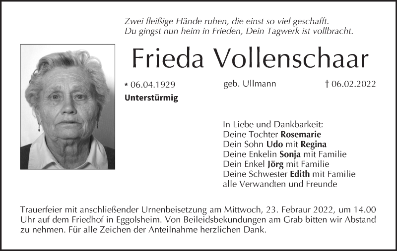Hier finden Sie alle Traueranzeigen aus der Zeitung, die bisher für Frieda Vollenschaar erschienen sind. Weitere Traueranzeigen, die in der Zeitung erscheinen, werden hier ebenfalls aufgelistet