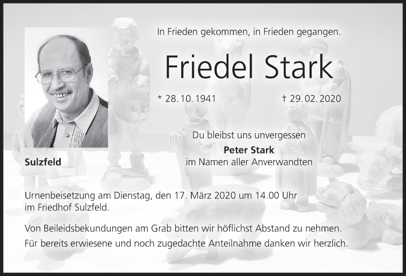 Hier finden Sie alle Traueranzeigen aus der Zeitung, die bisher für Friedel Stark erschienen sind. Weitere Traueranzeigen, die in der Zeitung erscheinen, werden hier ebenfalls aufgelistet