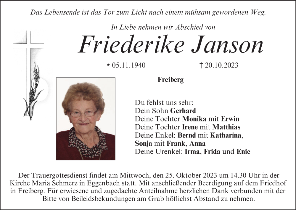 Hier finden Sie alle Traueranzeigen aus der Zeitung, die bisher für Friederike Janson erschienen sind. Weitere Traueranzeigen, die in der Zeitung erscheinen, werden hier ebenfalls aufgelistet