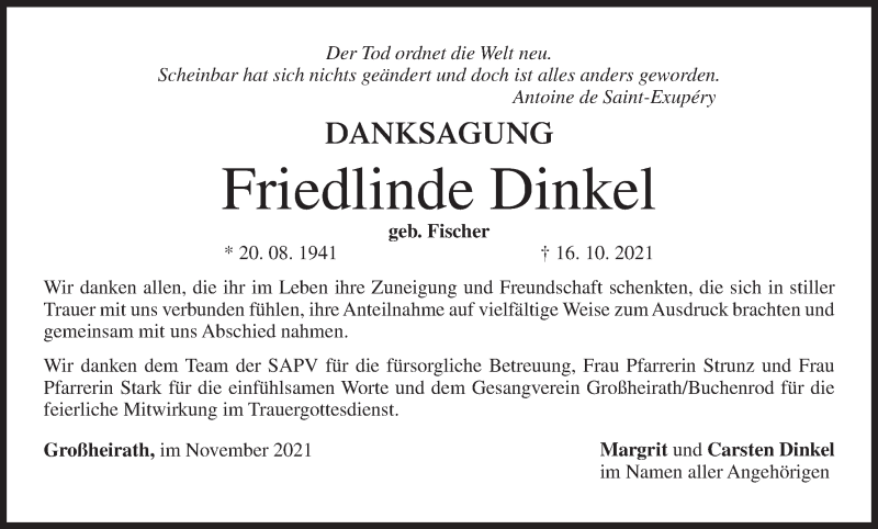 Hier finden Sie alle Traueranzeigen aus der Zeitung, die bisher für Friedlinde Dinkel erschienen sind. Weitere Traueranzeigen, die in der Zeitung erscheinen, werden hier ebenfalls aufgelistet
