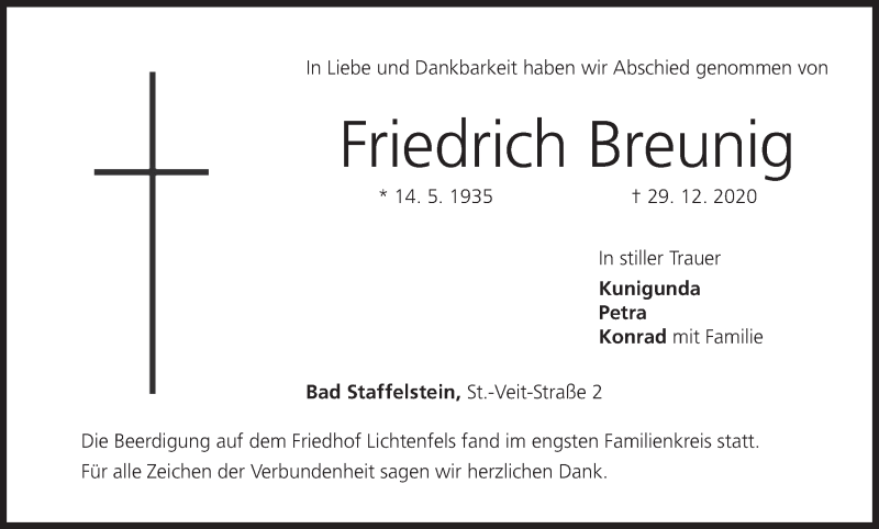 Hier finden Sie alle Traueranzeigen aus der Zeitung, die bisher für Friedrich Breunig erschienen sind. Weitere Traueranzeigen, die in der Zeitung erscheinen, werden hier ebenfalls aufgelistet