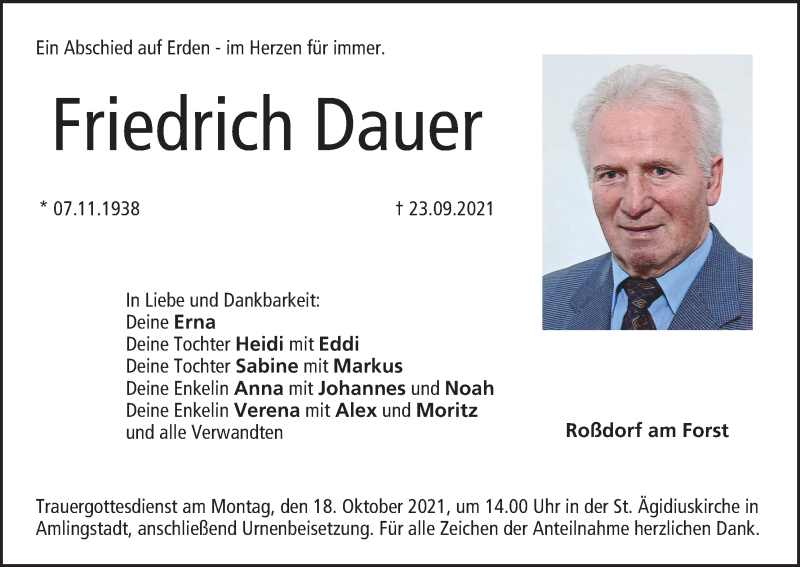 Hier finden Sie alle Traueranzeigen aus der Zeitung, die bisher für Friedrich Dauer erschienen sind. Weitere Traueranzeigen, die in der Zeitung erscheinen, werden hier ebenfalls aufgelistet