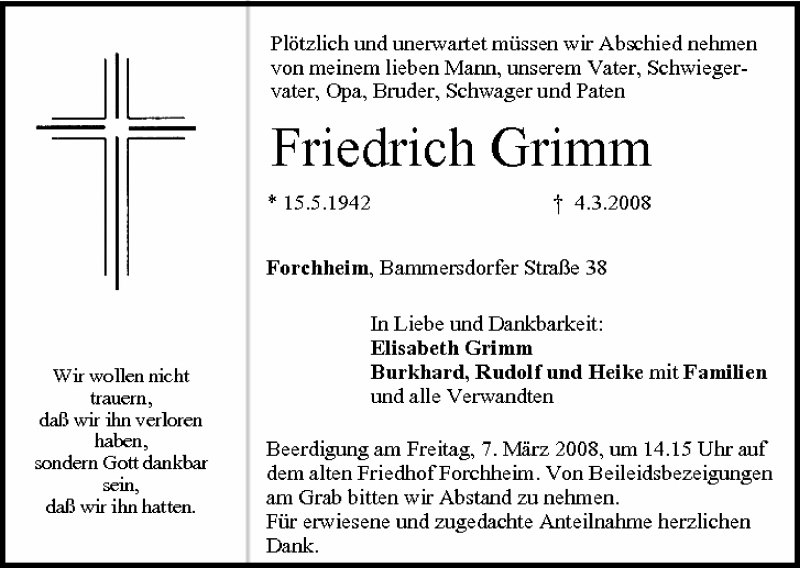 Hier finden Sie alle Traueranzeigen aus der Zeitung, die bisher für Friedrich Grimm erschienen sind. Weitere Traueranzeigen, die in der Zeitung erscheinen, werden hier ebenfalls aufgelistet