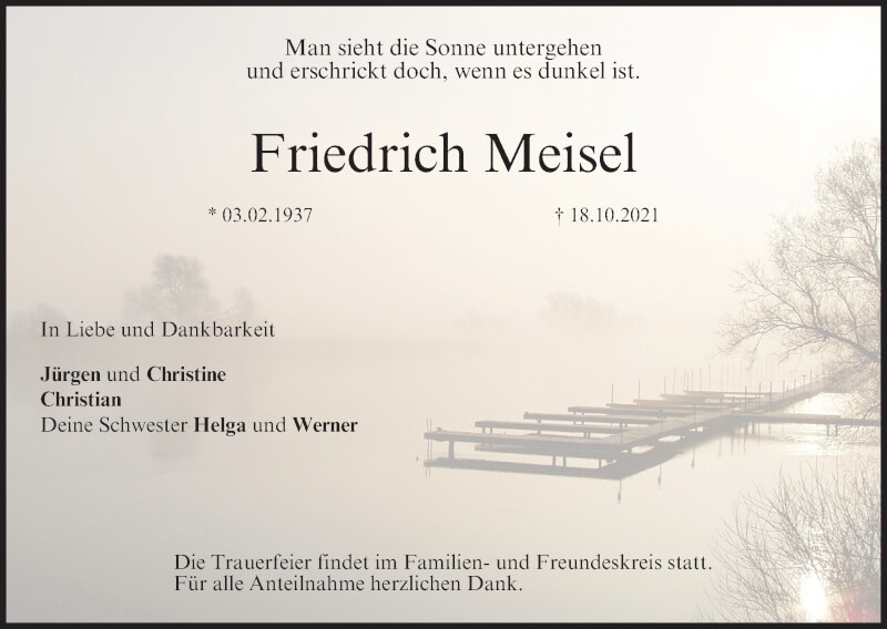 Hier finden Sie alle Traueranzeigen aus der Zeitung, die bisher für Friedrich Meisel erschienen sind. Weitere Traueranzeigen, die in der Zeitung erscheinen, werden hier ebenfalls aufgelistet