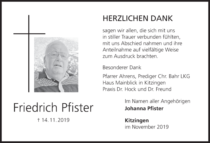 Hier finden Sie alle Traueranzeigen aus der Zeitung, die bisher für Friedrich Pfister erschienen sind. Weitere Traueranzeigen, die in der Zeitung erscheinen, werden hier ebenfalls aufgelistet