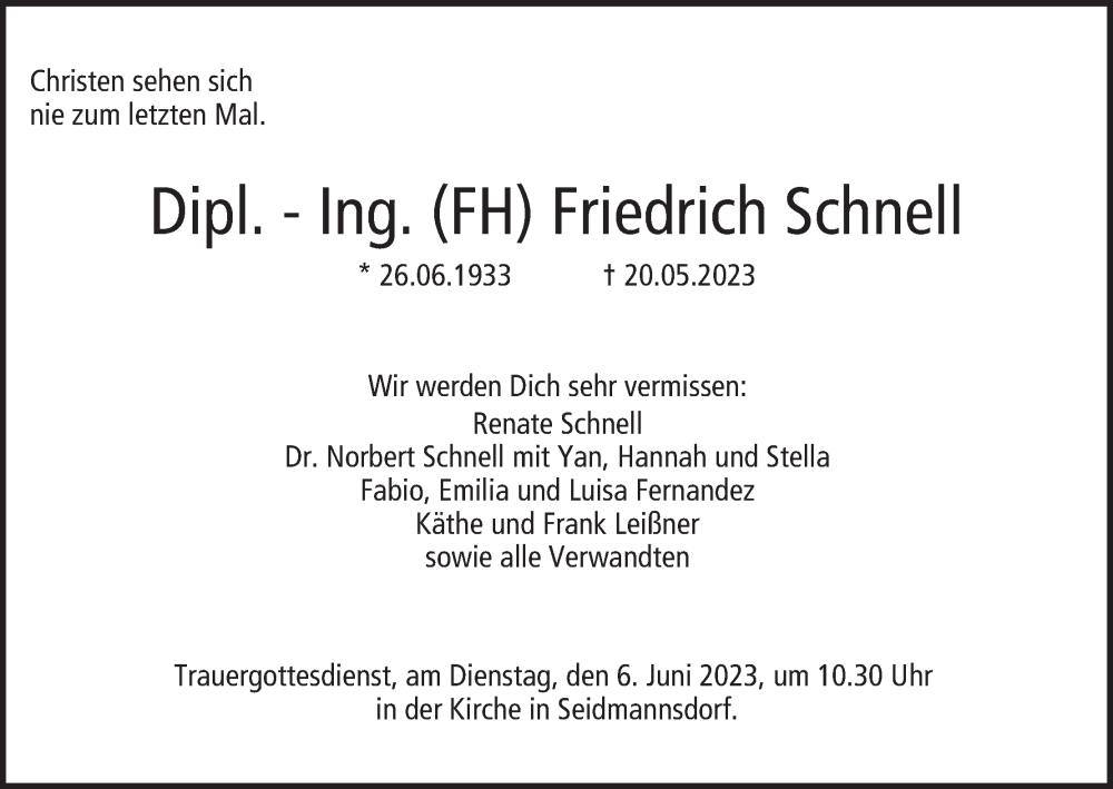 Hier finden Sie alle Traueranzeigen aus der Zeitung, die bisher für Friedrich Schnell erschienen sind. Weitere Traueranzeigen, die in der Zeitung erscheinen, werden hier ebenfalls aufgelistet