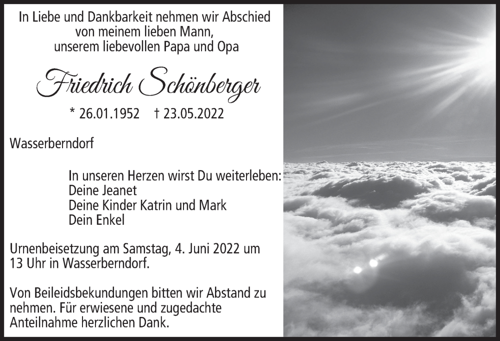 Hier finden Sie alle Traueranzeigen aus der Zeitung, die bisher für Friedrich Schönberger erschienen sind. Weitere Traueranzeigen, die in der Zeitung erscheinen, werden hier ebenfalls aufgelistet