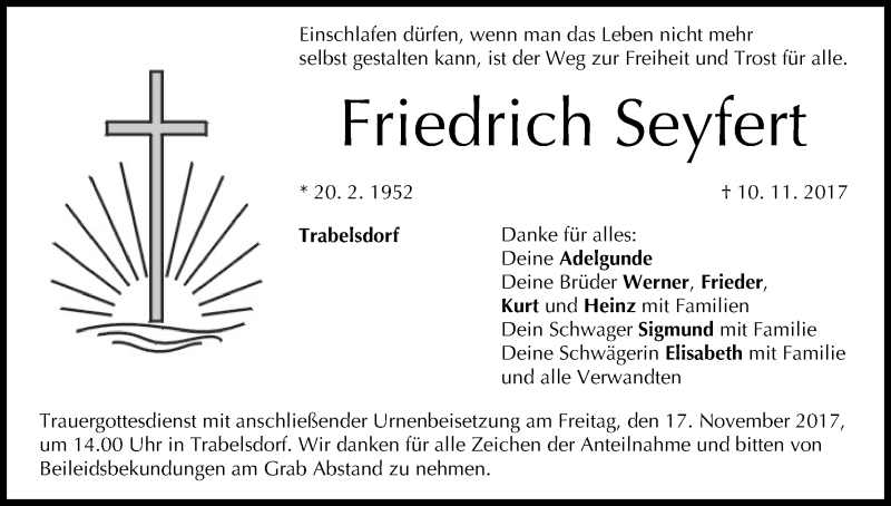 Hier finden Sie alle Traueranzeigen aus der Zeitung, die bisher für Friedrich Seyfert erschienen sind. Weitere Traueranzeigen, die in der Zeitung erscheinen, werden hier ebenfalls aufgelistet