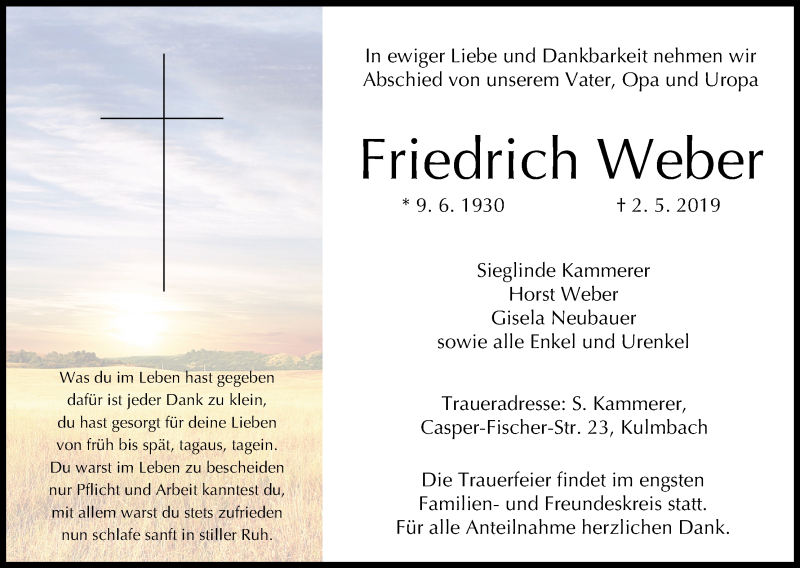 Hier finden Sie alle Traueranzeigen aus der Zeitung, die bisher für Friedrich Weber erschienen sind. Weitere Traueranzeigen, die in der Zeitung erscheinen, werden hier ebenfalls aufgelistet