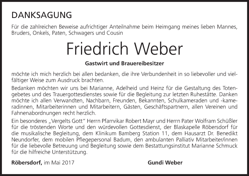 Hier finden Sie alle Traueranzeigen aus der Zeitung, die bisher für Friedrich Weber erschienen sind. Weitere Traueranzeigen, die in der Zeitung erscheinen, werden hier ebenfalls aufgelistet
