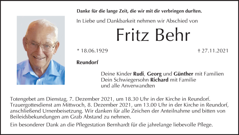 Hier finden Sie alle Traueranzeigen aus der Zeitung, die bisher für Fritz Behr erschienen sind. Weitere Traueranzeigen, die in der Zeitung erscheinen, werden hier ebenfalls aufgelistet