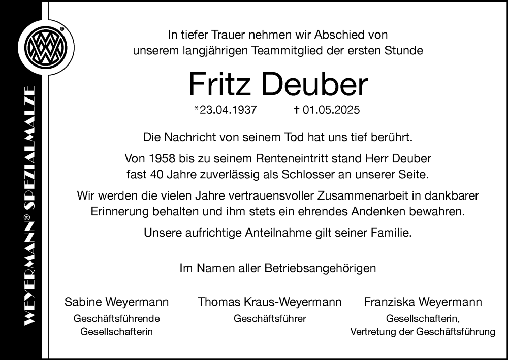 Hier finden Sie alle Traueranzeigen aus der Zeitung, die bisher für Fritz Deuber erschienen sind. Weitere Traueranzeigen, die in der Zeitung erscheinen, werden hier ebenfalls aufgelistet
