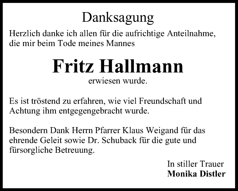 Hier finden Sie alle Traueranzeigen aus der Zeitung, die bisher für Fritz Hallmann erschienen sind. Weitere Traueranzeigen, die in der Zeitung erscheinen, werden hier ebenfalls aufgelistet