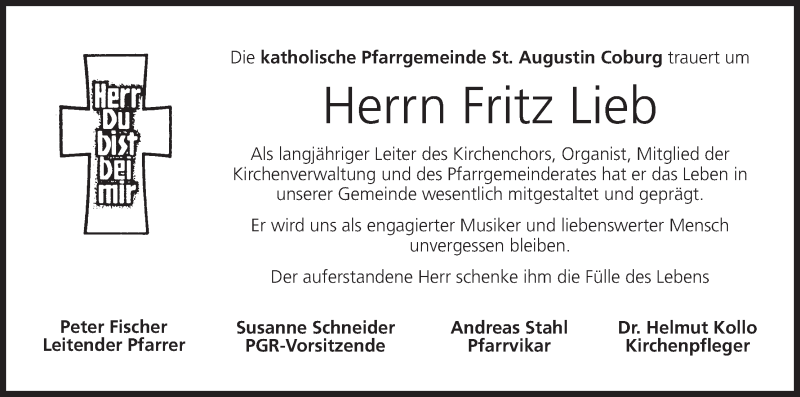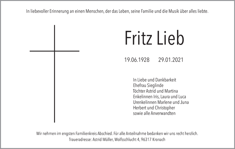 Hier finden Sie alle Traueranzeigen aus der Zeitung, die bisher für Fritz Lieb erschienen sind. Weitere Traueranzeigen, die in der Zeitung erscheinen, werden hier ebenfalls aufgelistet