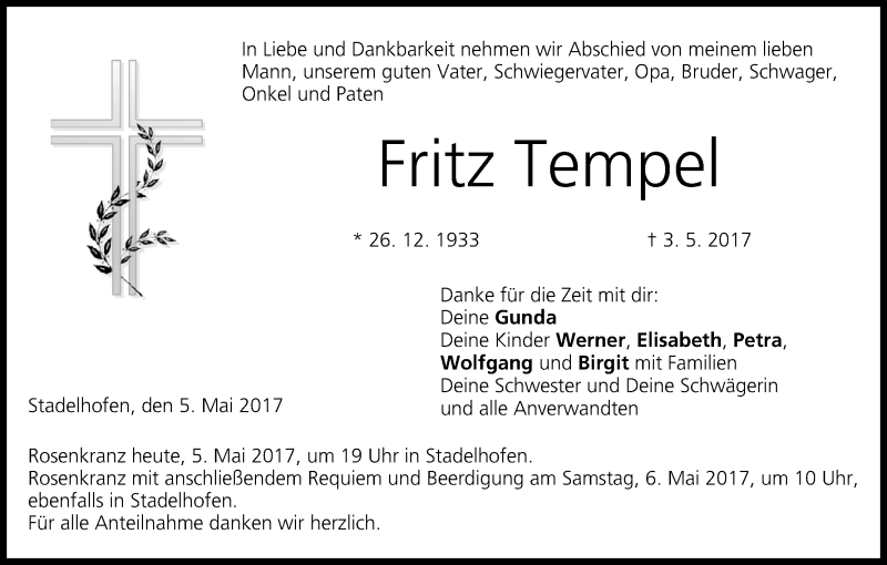 Hier finden Sie alle Traueranzeigen aus der Zeitung, die bisher für Fritz Tempel erschienen sind. Weitere Traueranzeigen, die in der Zeitung erscheinen, werden hier ebenfalls aufgelistet