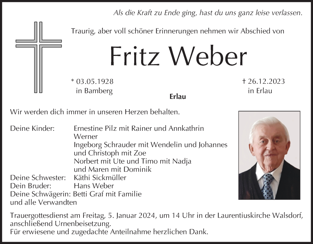 Hier finden Sie alle Traueranzeigen aus der Zeitung, die bisher für Fritz Weber erschienen sind. Weitere Traueranzeigen, die in der Zeitung erscheinen, werden hier ebenfalls aufgelistet