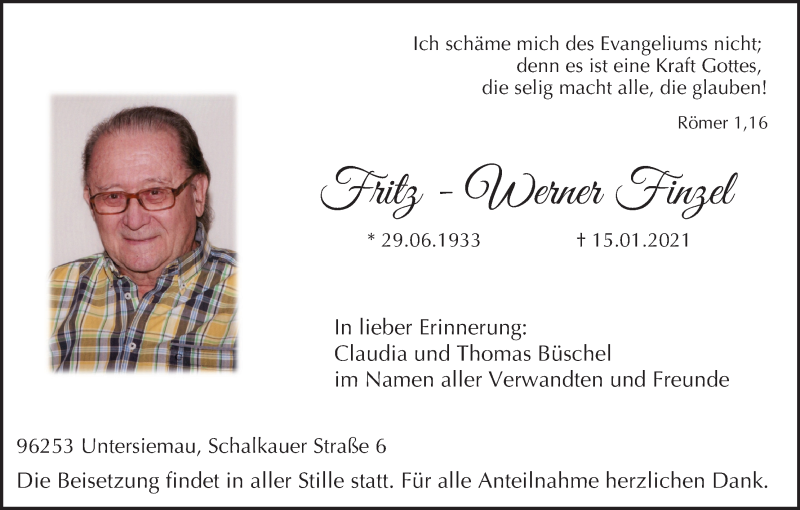 Hier finden Sie alle Traueranzeigen aus der Zeitung, die bisher für Fritz-Werner Finzel erschienen sind. Weitere Traueranzeigen, die in der Zeitung erscheinen, werden hier ebenfalls aufgelistet