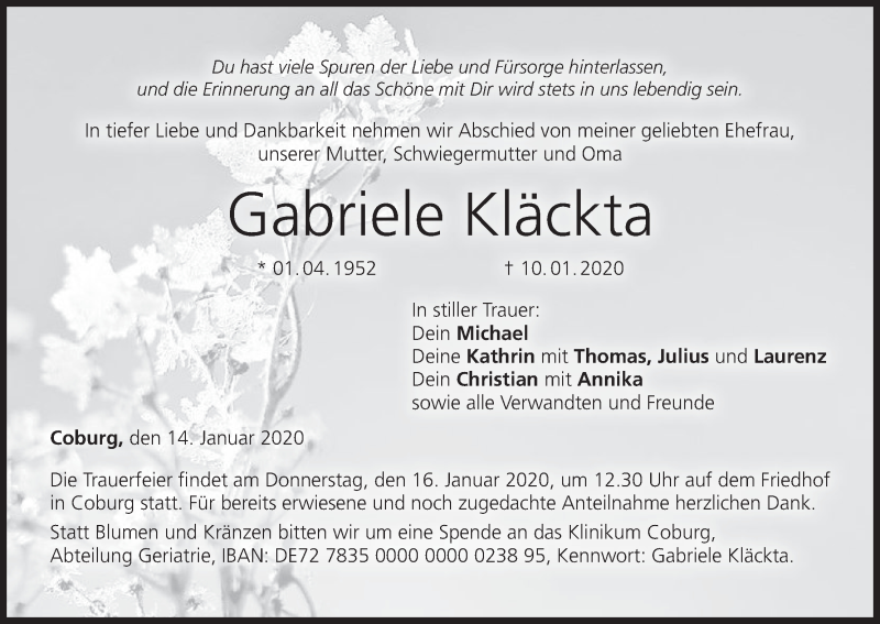 Hier finden Sie alle Traueranzeigen aus der Zeitung, die bisher für Gabriele Kläckta erschienen sind. Weitere Traueranzeigen, die in der Zeitung erscheinen, werden hier ebenfalls aufgelistet