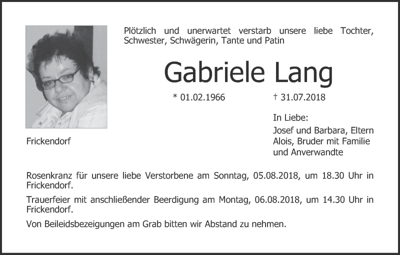 Hier finden Sie alle Traueranzeigen aus der Zeitung, die bisher für Gabriele Lang erschienen sind. Weitere Traueranzeigen, die in der Zeitung erscheinen, werden hier ebenfalls aufgelistet