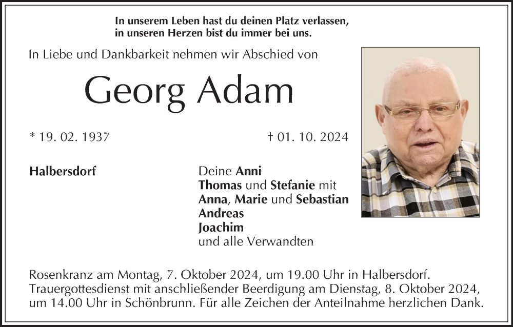 Hier finden Sie alle Traueranzeigen aus der Zeitung, die bisher für Georg Adam erschienen sind. Weitere Traueranzeigen, die in der Zeitung erscheinen, werden hier ebenfalls aufgelistet