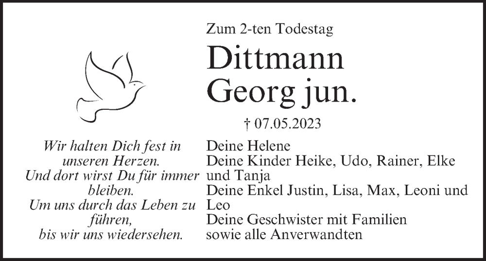 Hier finden Sie alle Traueranzeigen aus der Zeitung, die bisher für Georg Dittmann erschienen sind. Weitere Traueranzeigen, die in der Zeitung erscheinen, werden hier ebenfalls aufgelistet