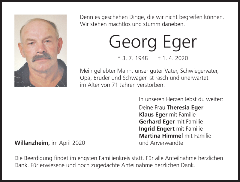Hier finden Sie alle Traueranzeigen aus der Zeitung, die bisher für Georg Eger erschienen sind. Weitere Traueranzeigen, die in der Zeitung erscheinen, werden hier ebenfalls aufgelistet