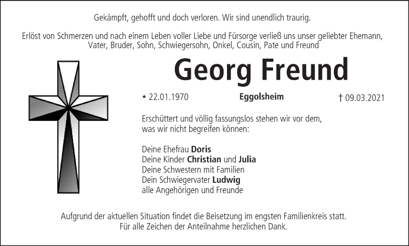 Hier finden Sie alle Traueranzeigen aus der Zeitung, die bisher für Georg Freund erschienen sind. Weitere Traueranzeigen, die in der Zeitung erscheinen, werden hier ebenfalls aufgelistet